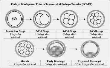 As I told you in my previous post, Day 1 post egg retrieval showed that we had 6 fertilized eggs! The doctor's office told us that we would be getting a call each day with a report on how they were progressing. The embryologist (who knew such a person even existed?) uses a grading system of poor, fair, good, excellent/good and excellent. They also are very concerned with how many cells each one has each day. Before I give you the numbers, I want to share a few pictures that I think are very helpful in understanding the different stages in embryo development. I know all of this information I've been giving you guys over the past few weeks is super in depth and foreign and mind boggling. It is for me, too! Pictures do seem to make it all a little easier to understand.
